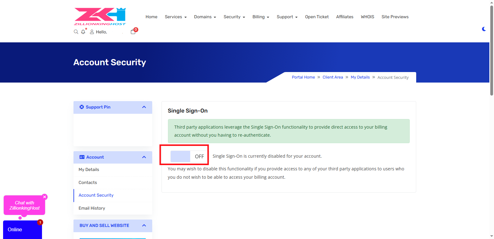 Step 3) Under the Single Sign-On, click the button to turn it off.